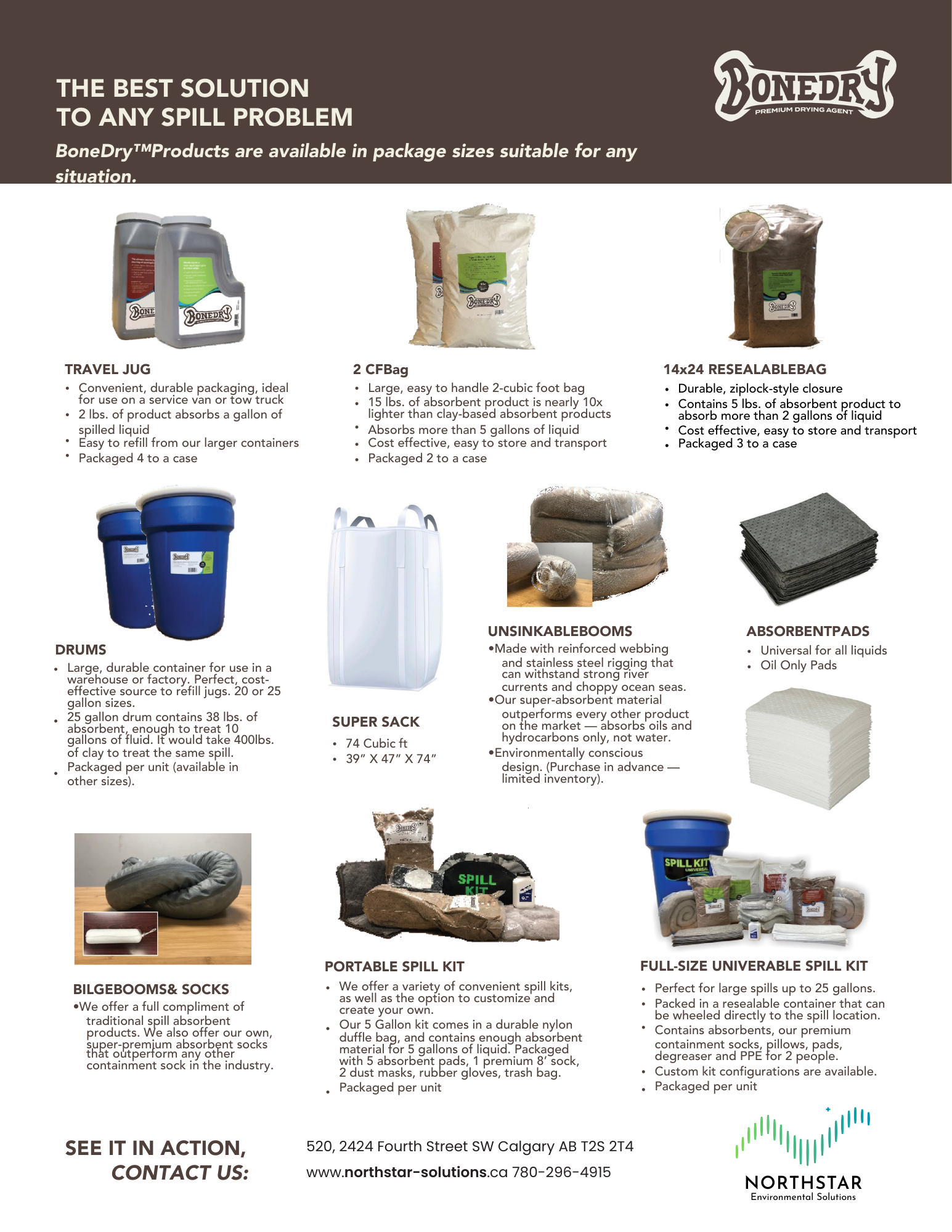 BoneDry™ is a chemical-free alternative to clay absorbents trusted by oil field operators across Alberta, BC, and Saskatchewan. Compliant with AER (AB), BCER (BC), and Saskatchewan Ministry of Environment standards. One 2 cu ft bag absorbs over 5 gallons of hydrocarbons — replacing 400 lbs of clay — with zero hazmat disposal cost. Non-toxic, non-leaching, WHMIS compliant, and fully landfill-safe.